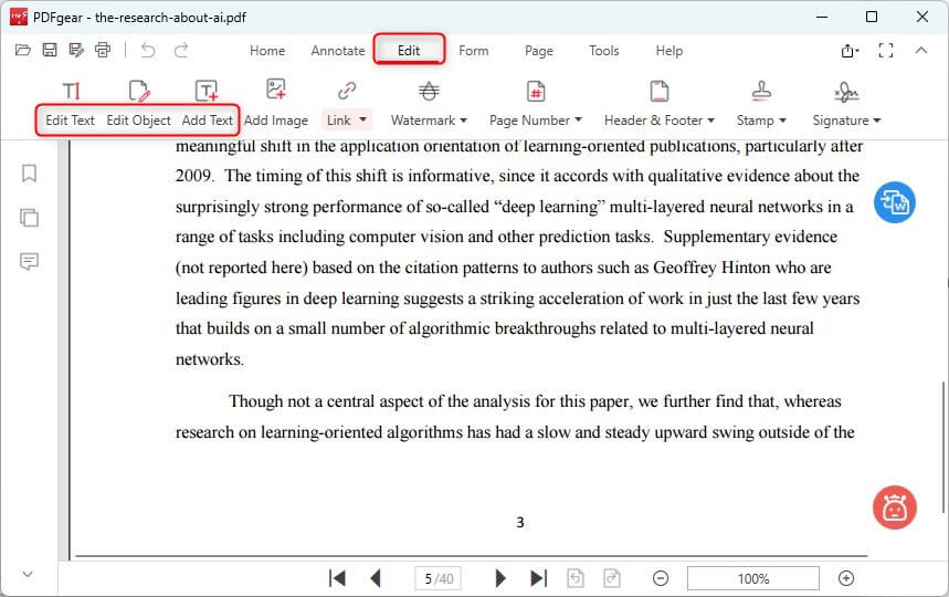 PDFgear, on the other hand, uses a GPT‑powered AI assistant to quickly summarize, extract insights, translate, and manage large PDFs. This makes it especially useful for reading research papers or lengthy documents where speed and efficiency matter.